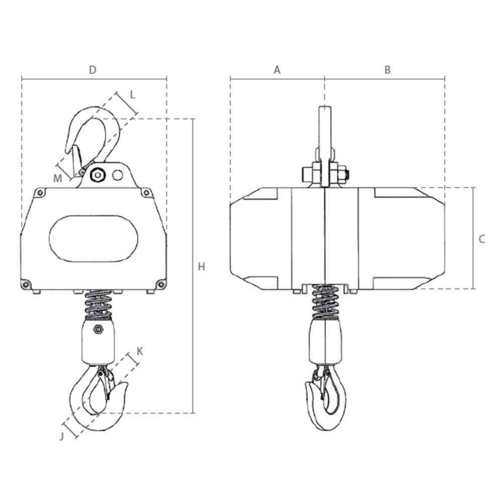 | Ref | CMU(T) | levée | vitesse(m/min) | chaine | Nb brins | poids(kg) | A | B | C | D | H | J | K | L | M |