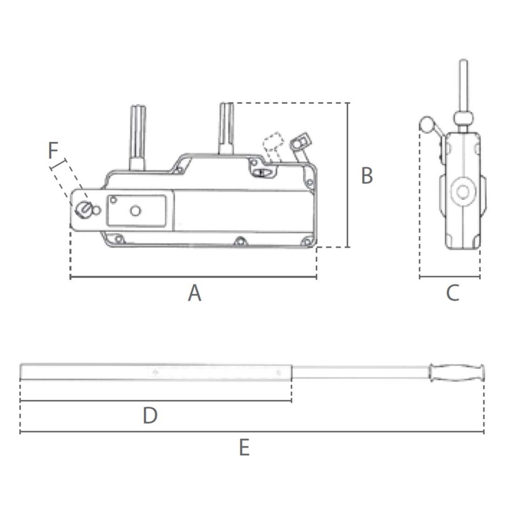 Capacite en levage (Kg) | Capacite en traction (T) | Ø câble (mm) | Rupture câble (Kn) | Avancement du câble(mm) | Poids (Kg) | A | B | C | D | E | F |